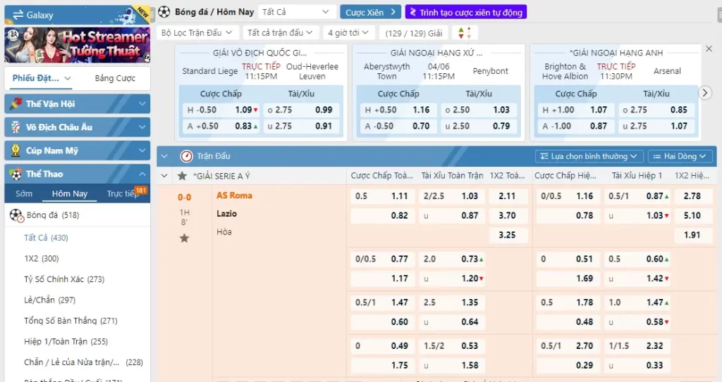 Các sảnh cập nhật nhanh các trận cầu hấp dẫn từ giải đấu lớn nhỏ trên thế giới như World cup, Premier League, Division, Primera, Ligue 1, NBA,…. Anh em sẽ vào kèo đa dạng, tùy thuộc vào kỹ năng và phán đoán của bản thân. Các loại kèo phổ biến có thể kể đến như kèo phạt góc, kèo thẻ đỏ, kèo cược tổng số bàn thắng, kèo 1×2, kèo châu Á,…